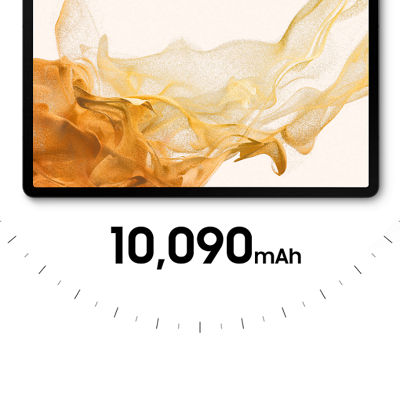 - El cargador se vende por separado. Valor típico probado bajo condiciones de laboratorios de terceros. El valor típico es el valor promedio estimado que considera la variación de la capacidad de la batería entre las muestras de batería probadas bajo la norma IEC 61960. La capacidad nominal (mínima) de la Galaxy Tab S8+ es de 9,800 mAh. La duración real de la batería puede variar según el entorno de red, los patrones de uso y otros factores.